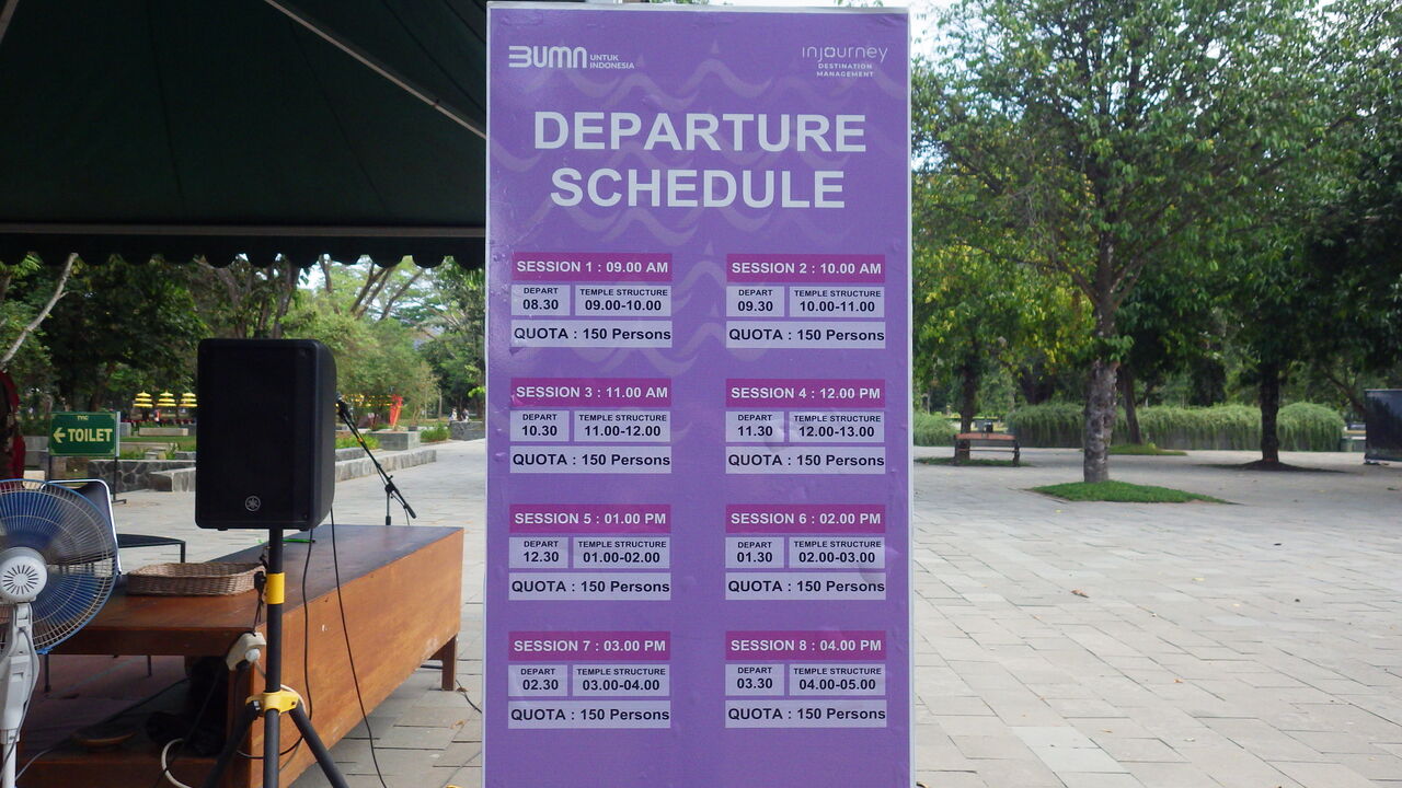 ボロブドゥール寺院 (Candi Borobudur) に登るという場合、時間ごとに人数制限がかけられていて (1時間につき150人)、インフォメーションセンター前から決められたグループごとに移動することになります。なお、私は、事前にネットで、最終のSection8 (午後4時から) のものに申し込みました。