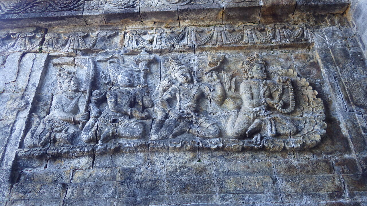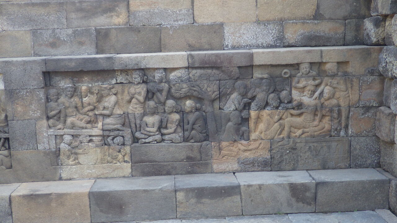 遺跡の上に登る前に、ガイドさんから、基壇のところで描かれているレリーフについての説明を受けました。このレリーフには、煩悩に支配された「欲界」に住む人間の姿が描かれていて、享楽に対する仏教的な戒め「因果応報」の意味が込められているそうです。以下の写真は、基壇に描かれている、因果応報を説いた「醜悪な顔」のレリーフです。